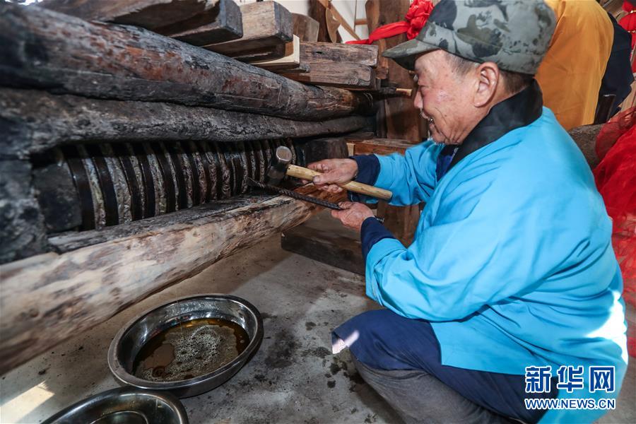 12月15日,老油坊的木龍中經(jīng)過壓榨的茶餅開始出油。 新華社記者 徐昱 攝