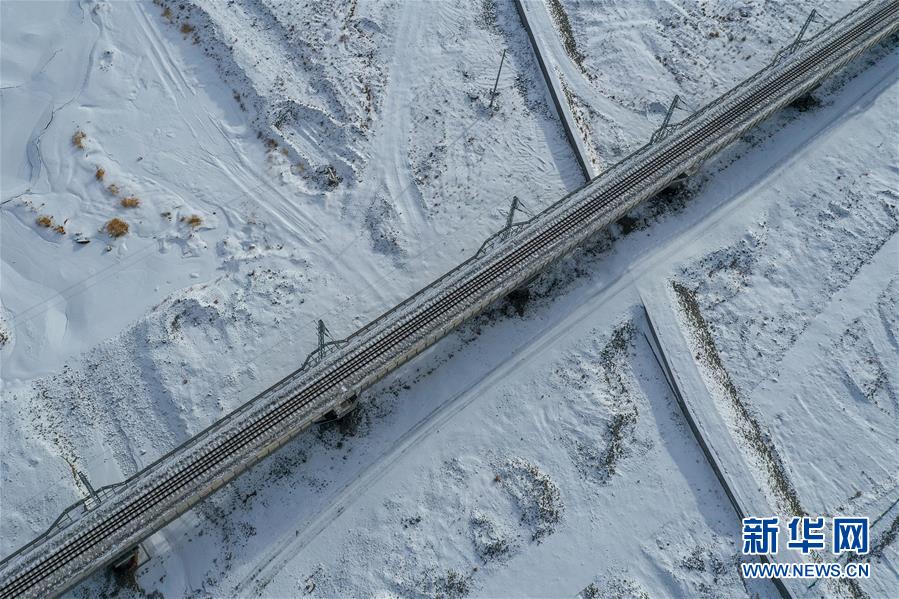 這是12月16日無人機(jī)拍攝的敦煌鐵路大柴旦站附近的一處鐵路橋。新華社記者張龍攝