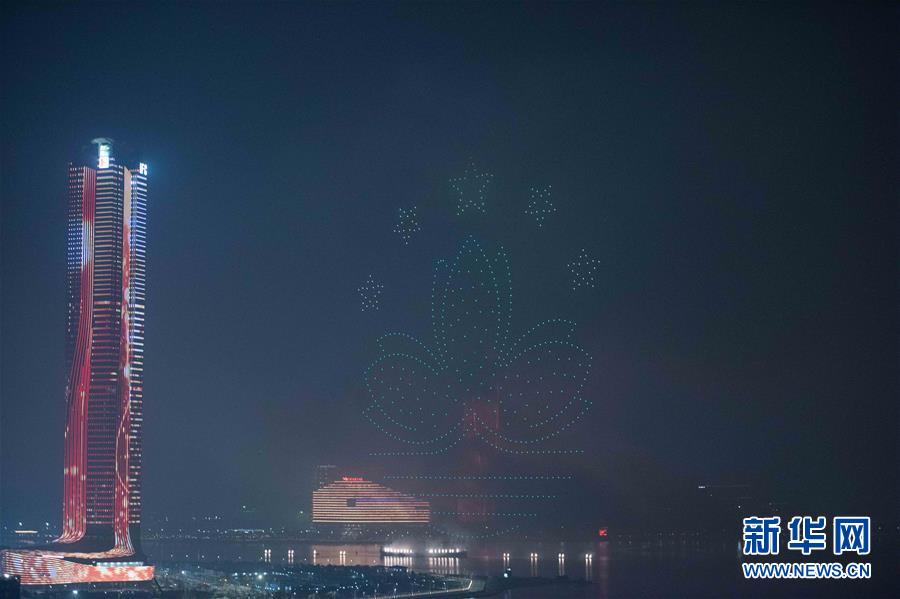 12月22日拍攝的煙花匯演上的無人機(jī)表演。當(dāng)晚,澳門與珠海首次聯(lián)合舉行煙花匯演,慶祝澳門回歸祖國20周年。新華社記者張金加攝