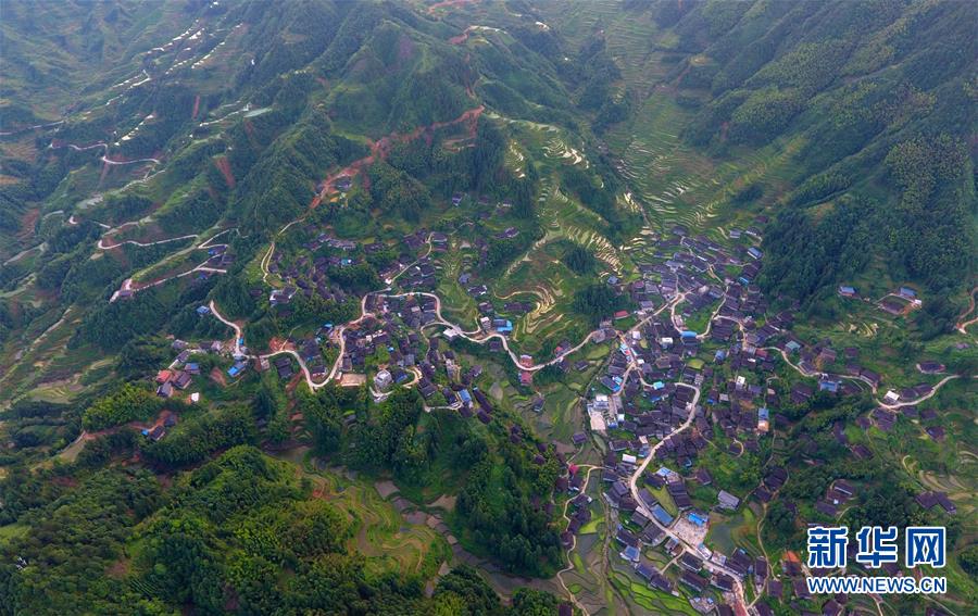 在融水苗族自治縣桿洞鄉(xiāng)黨鳩村下黨鳩屯,道路已經(jīng)修到家家戶戶門前(6月21日無(wú)人機(jī)拍攝)。新華社記者黃孝邦攝