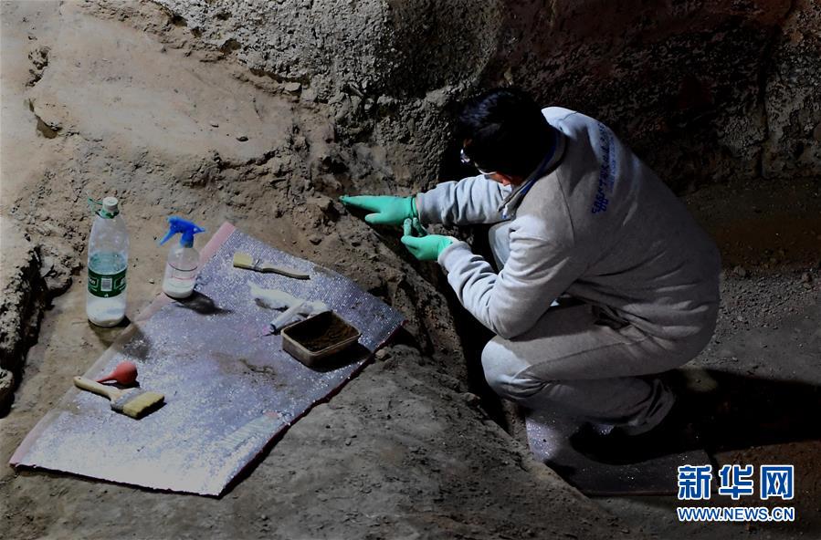 在河南鄭州大河村遺址博物館,科研人員在對(duì)仰韶文化房基進(jìn)行體檢、加固(12月11日攝)。