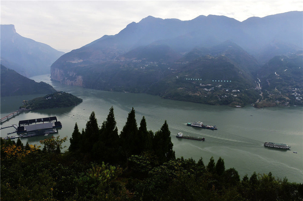 2019年11月2日,重慶,各種上行船舶正在通過白帝城前方的三峽夔門,蓄水后貨暢其流、往來無阻的水運(yùn)業(yè)彰顯“黃金水道”的社會效益。