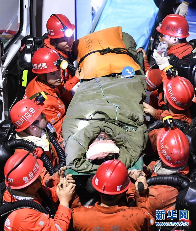 12月18日,救援人員轉(zhuǎn)運安全升井的被困人員。 當日7時56分,經(jīng)過80多個小時的緊張救援,發(fā)生透水事故的川煤集團杉木樹煤礦13名被困人員全部安全升井。 新華社記者 薛玉斌 攝