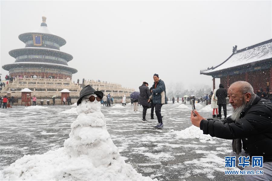 12月16日,在北京天壇公園,一名游客拍攝雪人。 當日,北京迎來降雪天氣。 新華社記者 鞠煥宗 攝