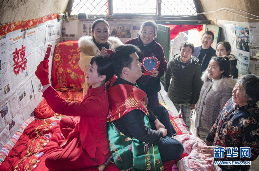 12月18日,在志丹縣金丁鎮(zhèn)謝灣村舉行的一場陜北婚俗表演中,鄉(xiāng)親們?yōu)椤靶氯恕笔崂怼_@是婚俗中的“并頭”環(huán)節(jié)。