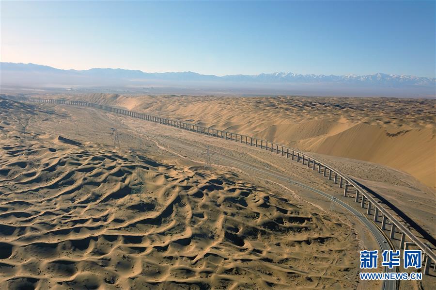 這是敦格鐵路沙山溝特大橋(12月11日無人機拍攝)。 敦(煌)格(爾木)鐵路沙山溝特大橋位于甘肅省酒泉市阿克塞哈薩克族自治縣境內(nèi)的庫姆塔格沙漠內(nèi),是一座穿越活動性沙漠地區(qū)的特長橋梁,也是敦格鐵路的重難點控制工程。據(jù)介紹,橋梁所在區(qū)域風沙活動頻繁,四季及晝夜溫差大,在建設過程中,中鐵十一局集團有限公司的建設者根據(jù)沙層的厚度、分布及含水率的不同,總結出一套沙丘樁基施工工藝。 新華社記者 范培珅 攝