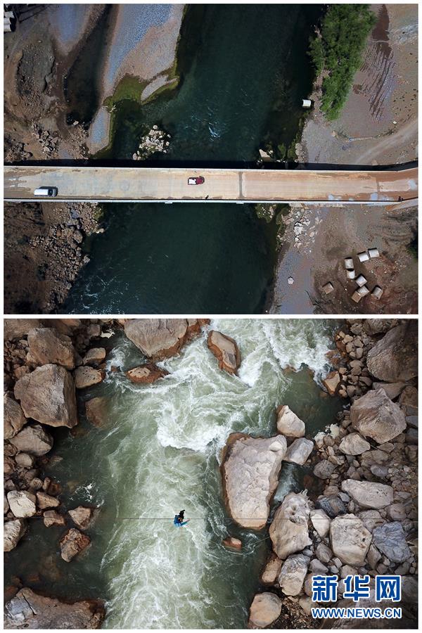 拼版照片:上圖為貴州省威寧縣海拉鎮(zhèn)海元村“溜索改橋”后的場景(2018年3月12日無人機拍攝);下圖為貴州省威寧縣海拉鎮(zhèn)花果村的村民利用尚未拆除的溜索過江(2018年3月12日無人機拍攝)。