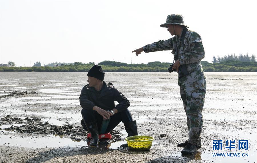 海南儋州新英灣紅樹林市級自然保護(hù)區(qū)護(hù)林員陳正平(右)在保護(hù)區(qū)內(nèi)的灘涂上向村民普及紅樹林濕地相關(guān)知識(12月10日攝)。陳正平2010年開始在保護(hù)區(qū)工作,他將工作發(fā)展成愛好,廣泛參加各種培訓(xùn)和業(yè)內(nèi)交流。他在工作中拍到瀕危鳥類白肩雕出現(xiàn)在海南的照片,這刷新了海南省的鳥種記錄。新華社記者楊冠宇攝