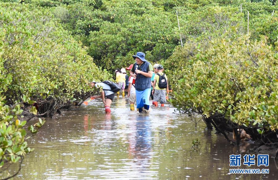 海南東寨港國家級自然保護(hù)區(qū)林業(yè)工程師馮爾輝(前)在保護(hù)區(qū)內(nèi)為學(xué)生進(jìn)行講解(7月16日攝)。 馮爾輝2009年大學(xué)畢業(yè)后來到保護(hù)區(qū)工作,小時候他家就住在紅樹林邊上,他從小和紅樹林打交道,喜歡動植物和鳥類。外貿(mào)專業(yè)畢業(yè)的他邊工作邊學(xué)習(xí),目前主要從事鳥類監(jiān)測、紅樹林保育、自然教育等工作。“紅樹林看著我長大”,馮爾輝說,濕地保護(hù)的工作非常有意義。 新華社發(fā)
