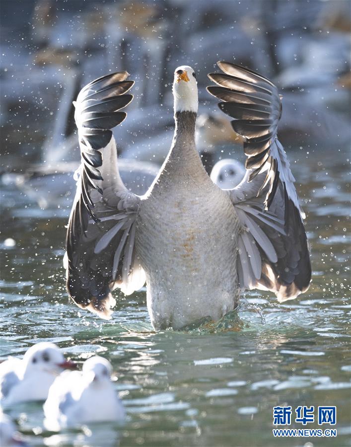 11月21日,候鳥在拉薩龍王潭公園水中嬉戲。時(shí)下,斑頭雁、紅嘴鷗等不少候鳥陸續(xù)飛抵拉薩河谷、雅魯藏布江沿岸等地避寒。新華社記者普布扎西攝