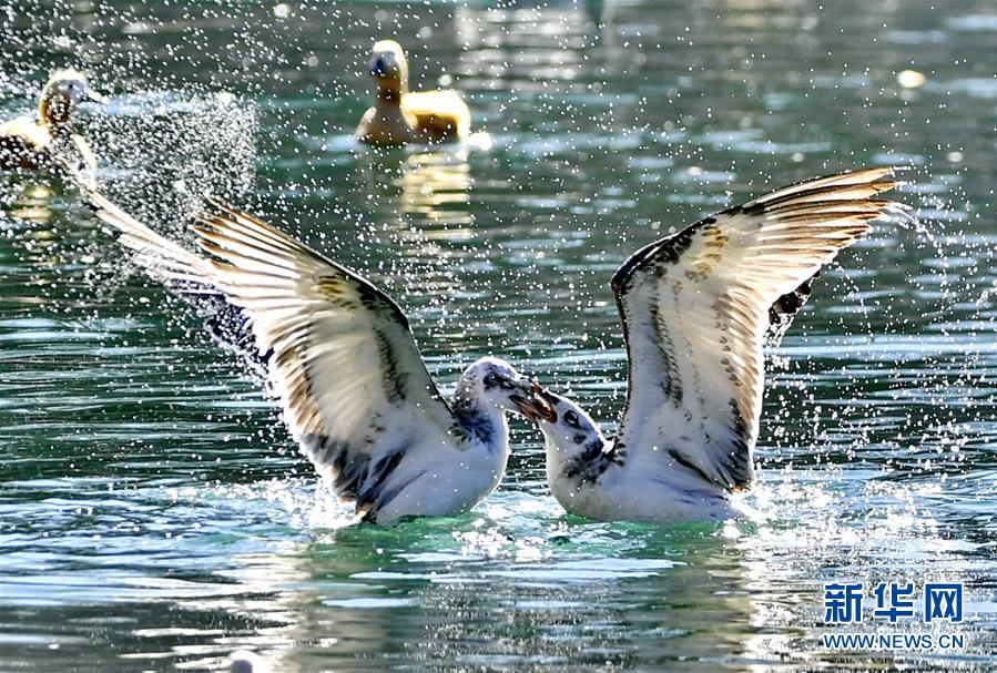 兩只紅嘴鷗在龍王潭公園的水面上爭食(12月20日攝)。新華社記者張汝鋒攝
