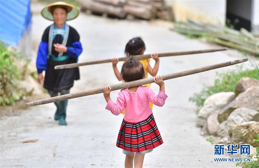 烏英苗寨的兩名小朋友幫大人拿扁擔回家(9月2日攝)。新華社記者黃孝邦攝