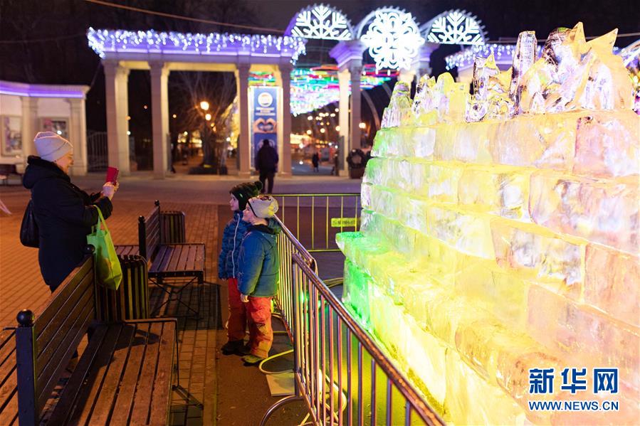 12月24日,在俄羅斯首都莫斯科,小朋友們與冰雕合影。 新華社記者 白雪騏 攝