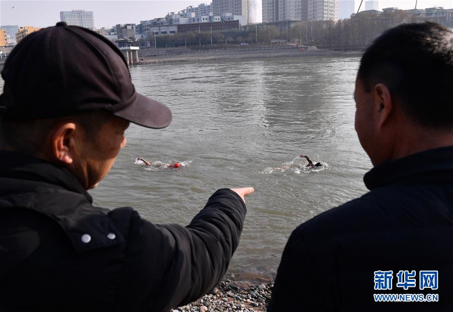 12月19日,在蘭州市馬拉松文化主題公園附近的黃河岸邊,冬泳愛好者入水準(zhǔn)備冬泳。新華社記者馬寧攝
