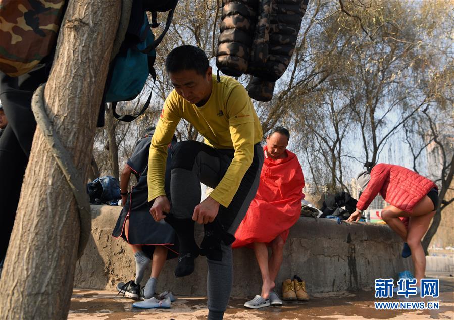 12月18日,冬泳愛好者準(zhǔn)備進(jìn)入黃河開始冬泳。新華社記者馬寧攝