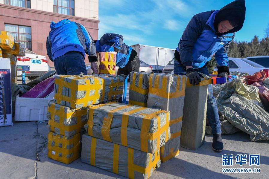12月27日,在吉林松原查干湖漁場(chǎng),快遞員將魚(yú)打包準(zhǔn)備發(fā)給客戶(hù)。新華社記者張楠攝