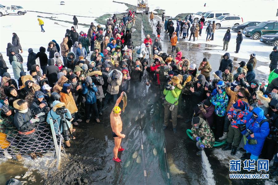 12月18日,一名冬泳愛(ài)好者展示冬捕魚(yú)(無(wú)人機(jī)拍攝)。新華社記者劉磊攝