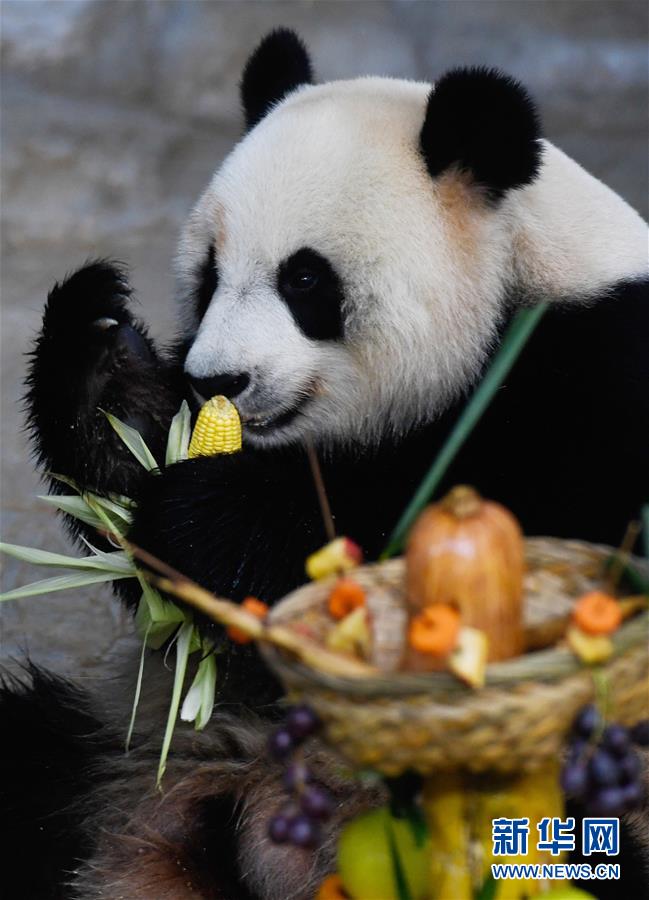 12月31日,大熊貓“貢貢”在吃葡萄。 新華社記者 楊冠宇 攝
