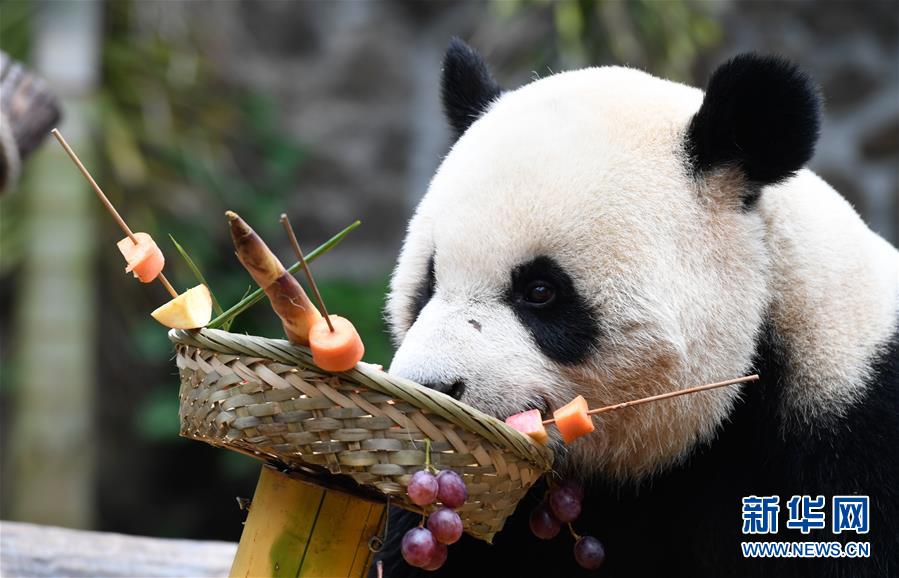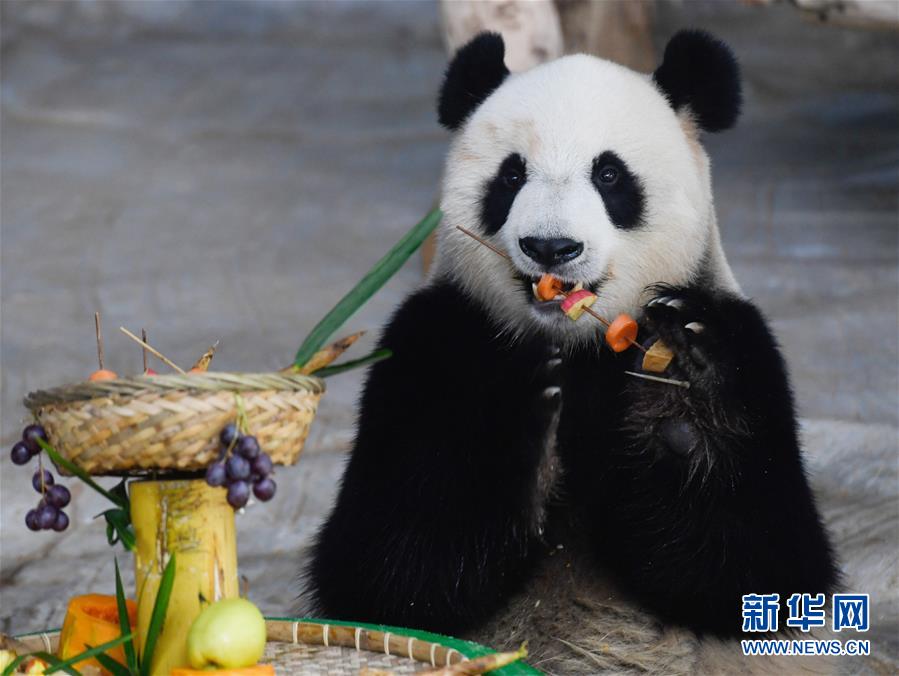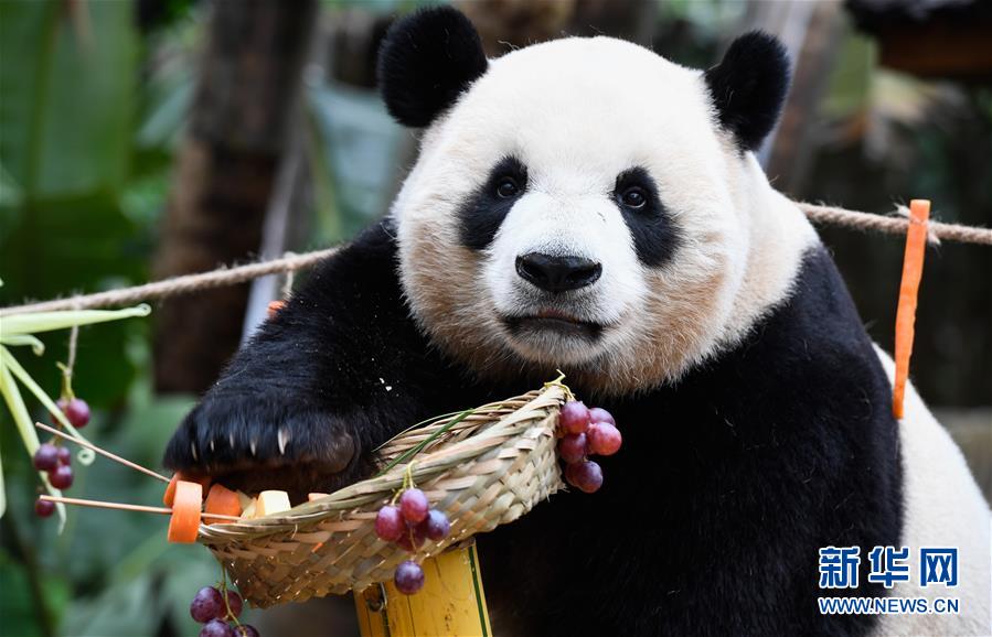 當(dāng)日是2019年最后一天,海南熱帶野生動植物園的工作人員為園區(qū)內(nèi)大熊貓“貢貢”“舜舜”準備了用葡萄、南瓜、竹筍等果蔬制作的“火鍋串串香”,讓它們用“擼串”的方式迎接新年的到來。 新華社記者 楊冠宇 攝