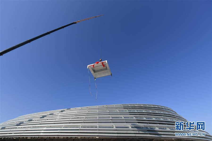 12月31日,施工人員在國(guó)家速滑館施工現(xiàn)場(chǎng)起吊最后一塊待安裝的屋面單元板塊。