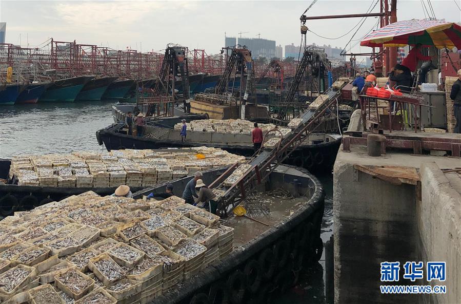 1月1日,滿載歸來的漁船陸續(xù)駛進(jìn)港灣,工人們在卸載漁獲。新華社記者潘強(qiáng)攝