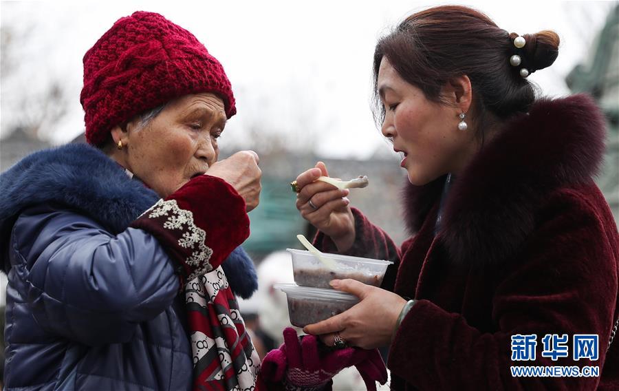 1月2日,兩位市民在閬中古城貢院廣場吃臘八粥。 當日是農(nóng)歷臘月初八臘八節(jié),四川閬中古城舉行“萬人同品臘八粥”活動,當?shù)鼐用窈捅姸嘤慰驮谪曉簭V場免費享用臘八粥。 新華社記者 江宏景 攝