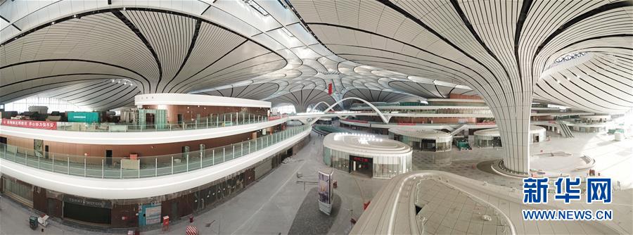 這是6月14日無(wú)人機(jī)拍攝的北京大興國(guó)際機(jī)場(chǎng)航站樓內(nèi)景(全景拼接照片)。新華社記者才揚(yáng)攝