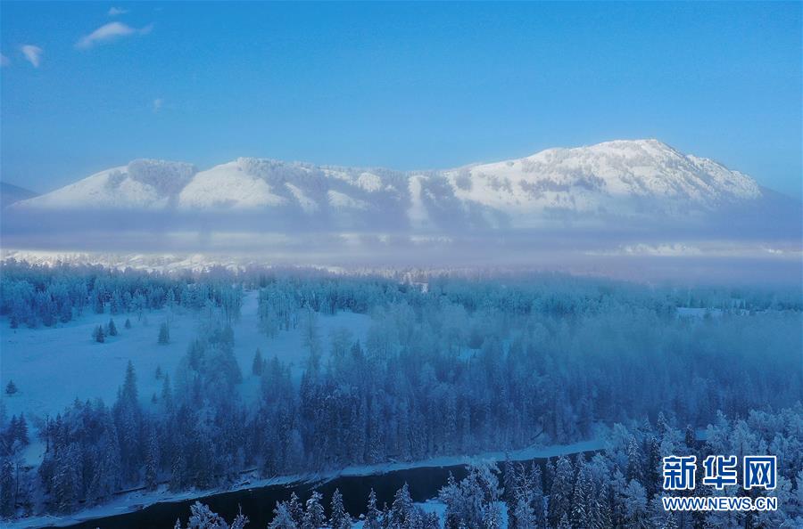 這是1月3日拍攝的喀納斯河畔的霧凇景觀(無人機(jī)照片)。