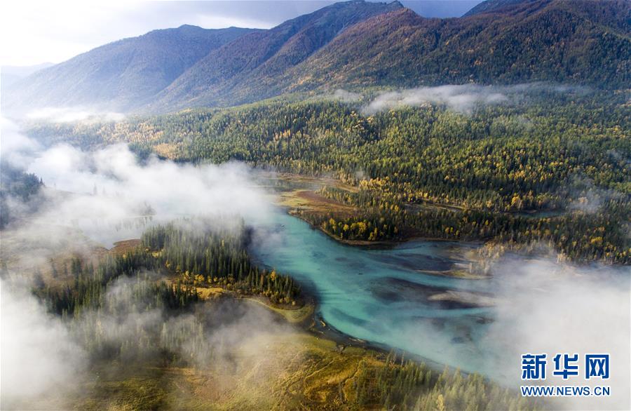 9月24日無人機(jī)拍攝的喀納斯景區(qū)風(fēng)光。新華社記者王菲攝