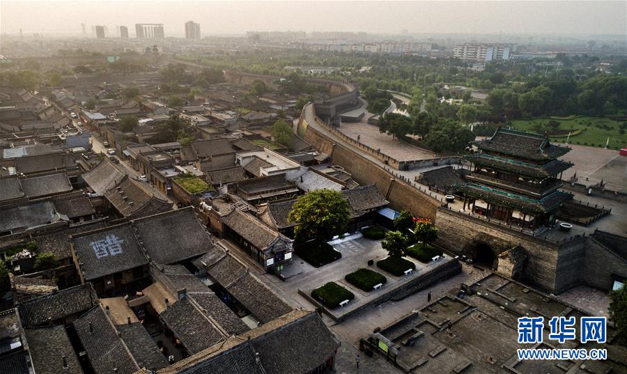 這是7月20日無(wú)人機(jī)拍攝的晨曦中的平遙古城。
