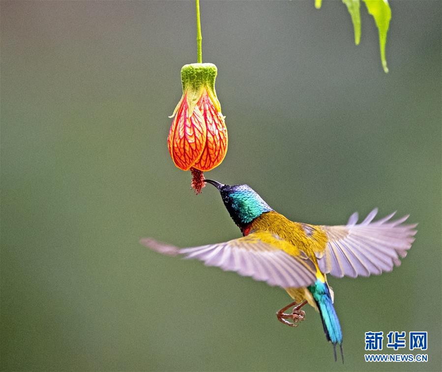 在福州市西湖公園,一只叉尾太陽(yáng)鳥在狀如燈籠的懸鈴花前懸停、采蜜(1月3日攝)。 新華社記者梅永存攝