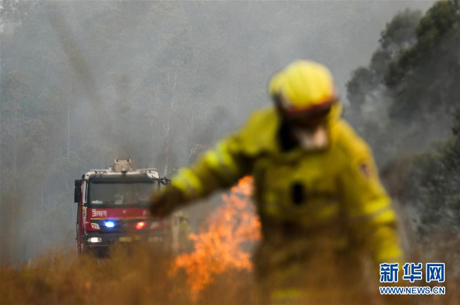2019年11月11日,在澳大利亞新南威爾士州塔里附近的山地,消防員在撲滅山火。新華社記者白雪飛攝