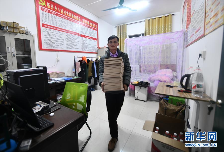 八好村駐村第一書記韋德王抱著扶貧材料走出辦公室,辦公室也是他的臥室(1月6日攝)。新華社記者黃孝邦攝