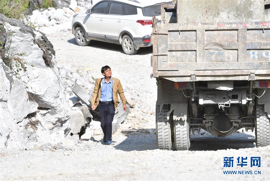 八好村弄豪屯的砂石路剛剛修通,碎石多、路況差,駐村第一書記韋德王駕車下屯途中,經(jīng)常要下車將大石塊搬走(2019年12月16日攝)。新華社記者黃孝邦攝