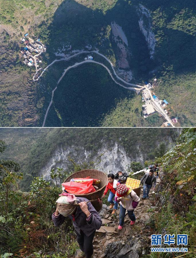 拼版照片:上圖為已經(jīng)修通水泥路的大化瑤族自治縣板升鄉(xiāng)八好村八好屯(2019年11月11日無(wú)人機(jī)拍攝);下圖為在尚未通路前,八好村八好屯村民背著年貨走山路回家(2016年1月26日攝)。新華社記者黃孝邦攝