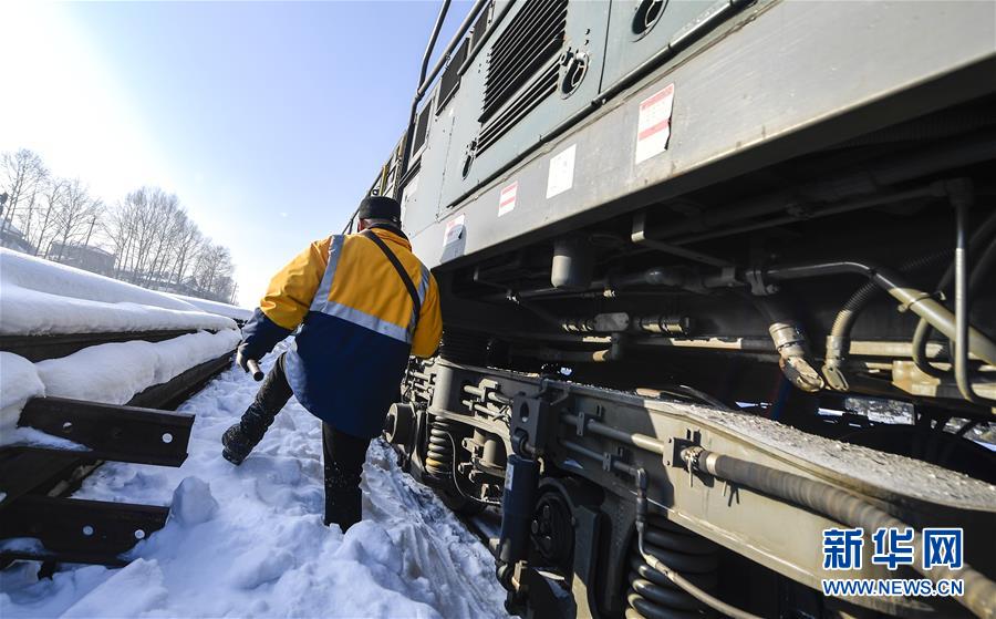 林海間的“送水小火車” 調(diào)車員對“送水小火車”進(jìn)行出行前的檢查作業(yè)(1月17日攝)。新華社記者 許暢 攝