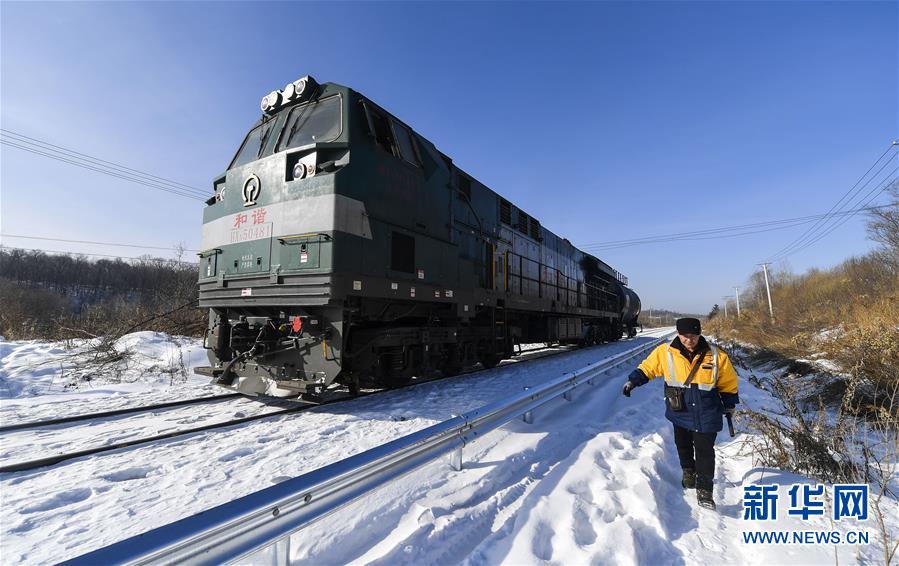 送水員黃衛(wèi)東在雪地中前行,準(zhǔn)備登上火車前往送水地點(diǎn)(1月17日攝)。新華社記者 許暢 攝
