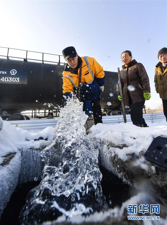 因?yàn)槎緶囟冗^低,送水員黃衛(wèi)東在蓄水前需要提前加熱閥門(1月17日攝)。新華社記者 許暢 攝
