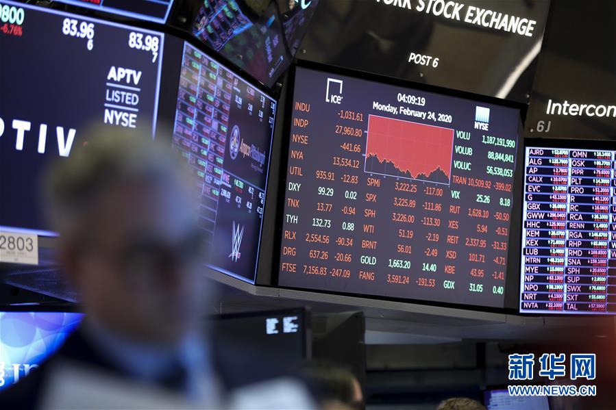 2月24日,美國紐約證券交易所的電子屏顯示當天收盤情況。新華社記者 王迎 攝