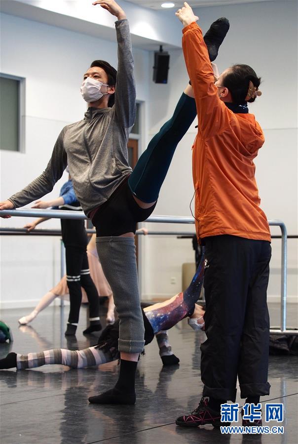 2月29日,在通過網(wǎng)絡(luò)直播的“公益公開課”上,上海芭蕾舞團(tuán)團(tuán)長辛麗麗(右)在指導(dǎo)首席演員吳虎生。新華社記者任瓏攝
