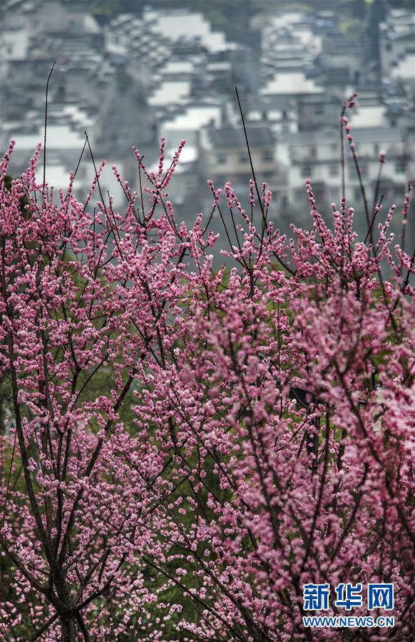3月2日,盛開的春梅映襯著平利縣長安鎮(zhèn)高峰村徽派農舍。新華社記者陶明攝