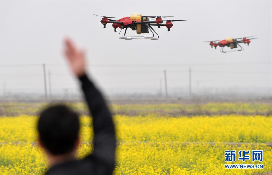 無人機(jī)在江西省南昌市南昌縣蔣巷鎮(zhèn)對油菜田進(jìn)行植保作業(yè)(2月28日攝)。新華社記者 彭昭之 攝