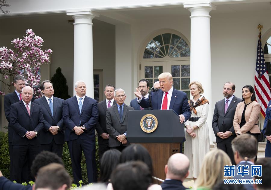3月13日,美國總統(tǒng)特朗普(中)在華盛頓白宮的記者會上講話。特朗普當天下午在白宮發(fā)表講話時正式宣布“國家緊急狀態(tài)”。他說,此舉旨在讓美國聯邦政府全力投入到抗擊新冠肺炎疫情的努力中。這項舉措將釋放500億美元資金,幫助各州和地方政府應對疫情。新華社記者劉杰攝