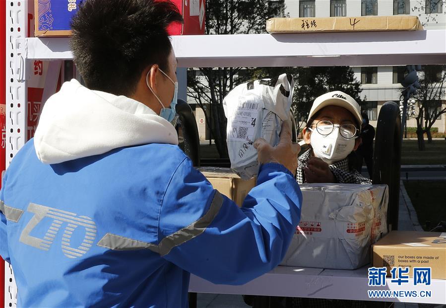 3月12日,李杰(左)在中國青年政治學院快遞點隔著柵欄給客戶遞送包裹。新華社記者張玉薇攝