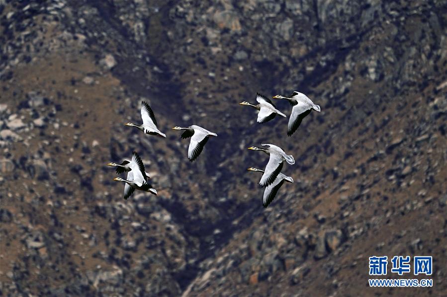 3月14日,斑頭雁在拉魯濕地上空飛翔。新華社記者張汝鋒攝