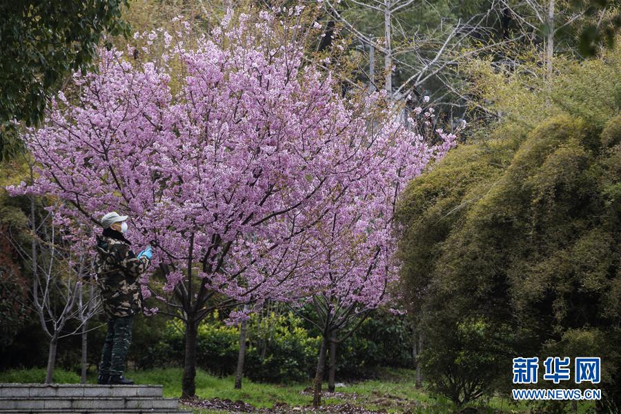 3月3日,一名工作人員在觀賞盛開(kāi)的櫻花。新華社記者費(fèi)茂華攝