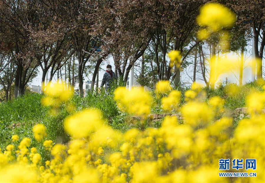 3月14日,在武漢市西北部市郊,一名市民從油菜花田前走過(guò)。隨著氣溫升高,春意在武漢的枝頭上萌動(dòng),花朵漸次開(kāi)放。新華社記者肖藝九攝