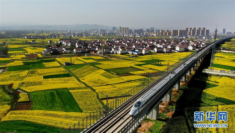 3月14日,一列動車從洋縣油菜花海中駛過(無人機(jī)照片)。 新華社記者陶明攝