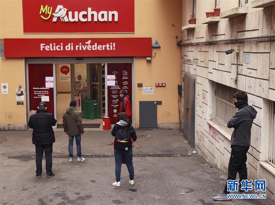 3月14日,在意大利首都羅馬,顧客排隊等待進入超市。新華社記者劉詠秋攝