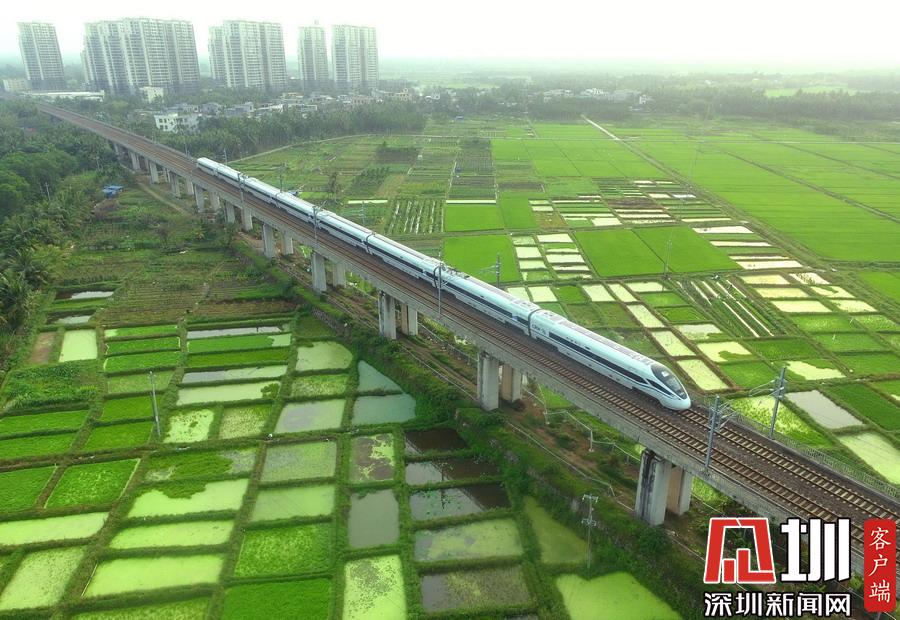 2020年3月17日,海南環(huán)島鐵路一列動車從春光明媚的瓊海城區(qū)經(jīng)過。
